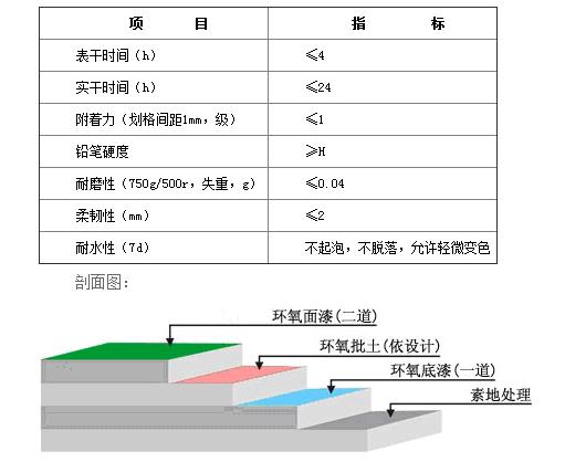 ④ 环氧面漆:溶济型环氧面漆或止滑面漆滚涂二道,完工后整体表面光亮洁净,颜色均一,无空鼓;