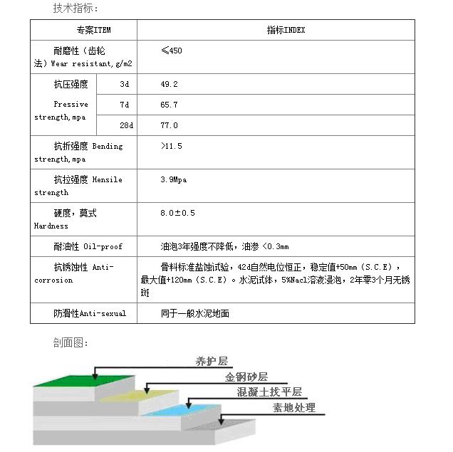 ③ 金钢砂层:先将2/3硬化剂(金属骨料或非金属骨料)均匀撒布,让材料充分吸收混凝土中水份,用抹光机械抹平;再将余下1/3硬化剂均匀撒布,抹平。当混凝土不被破坏时,再抹平,收光;